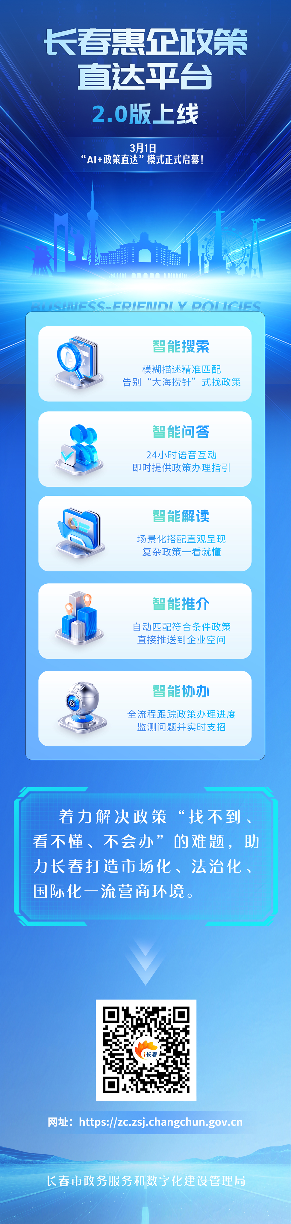 長(zhǎng)春市政數(shù)局營(yíng)商環(huán)境服務(wù)處二級(jí)調(diào)研員傅強(qiáng)介紹,2021年,長(zhǎng)春惠企政策直達(dá)平臺(tái)1.0版上線。經(jīng)過(guò)五年實(shí)踐打磨完成全面升級(jí),2.0版主打大數(shù)據(jù)+人工智能技術(shù),從企業(yè)視角打造AI應(yīng)用場(chǎng)景,讓企業(yè)輕松找政策、方便辦政策。