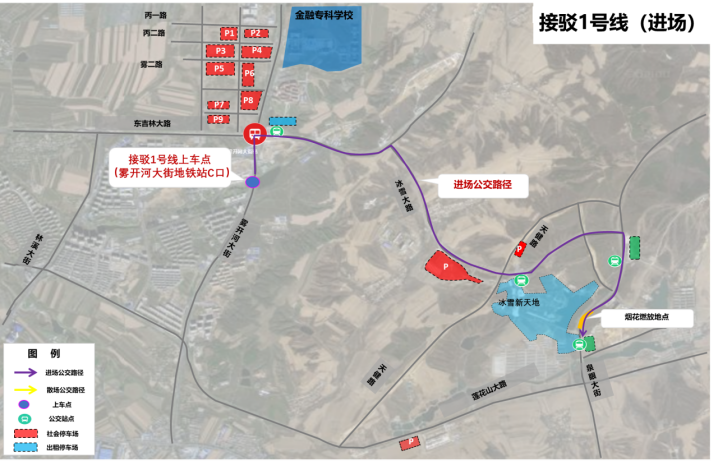 游客將私家車停放在蓮花山大型活動(dòng)臨時(shí)停車場,換乘停車場擺渡車到地鐵霧開河大街站A口下車后,游客步行至C口換乘接駁1號(hào)線公交車,前往冰雪新天地1、2號(hào)門。(如下二圖)