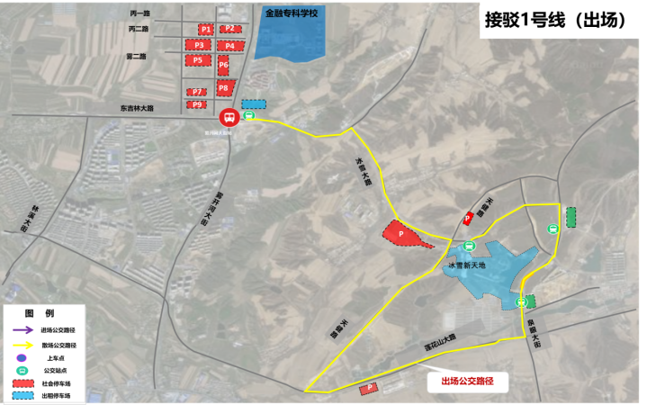 1號(hào)門:游客在冰雪新天地1號(hào)門(天健路公交車臨時(shí)站點(diǎn))乘坐接駁2號(hào)線公交車返回地鐵霧開河大街站B口,轉(zhuǎn)乘地鐵等交通方式離開蓮花山。(如下圖)