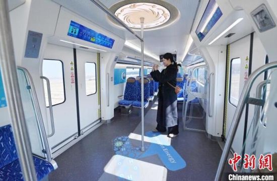 3月21日,全球首列氫能源市域列車在長春進行時速160公里滿載運行試驗。圖為列車車廂內(nèi)部。中新社記者 張瑤 攝