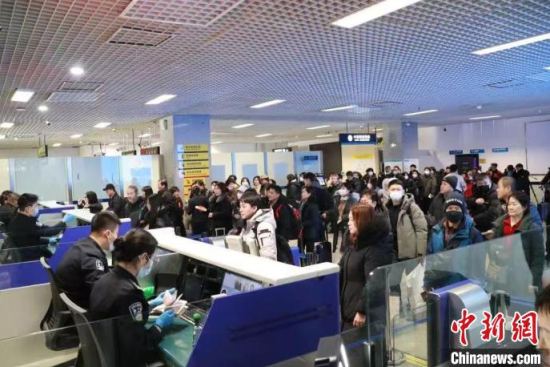 今年春節(jié)假期期間,入境旅客在延吉機場排隊等候查驗。(資料圖)麻馨允 攝