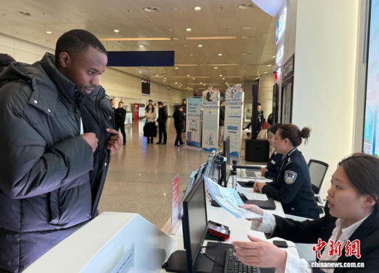 1月20日,吉林長春,外國留學(xué)生在長春龍嘉國際機(jī)場“吉便利”出入境一站式綜合服務(wù)窗口辦理相關(guān)業(yè)務(wù)!≈行律缬浾 張瑤 攝