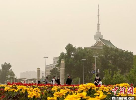 長春文化廣場雕塑。 郭佳 攝市民在公園散步!」选z城市上空昏黃一片!」选z沙塵天氣使能見度降低。 郭佳 攝城市綠樹被沙塵籠罩!」选z