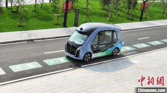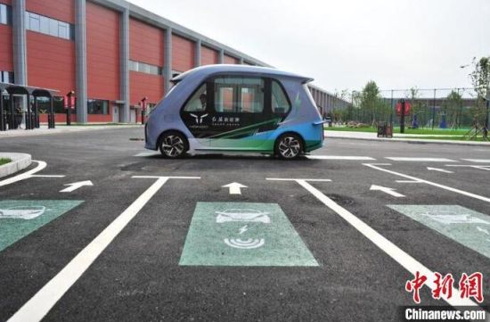 一輛新能源電動(dòng)車駛過(guò)高功率動(dòng)態(tài)無(wú)線充電道路系統(tǒng)的泊車位。