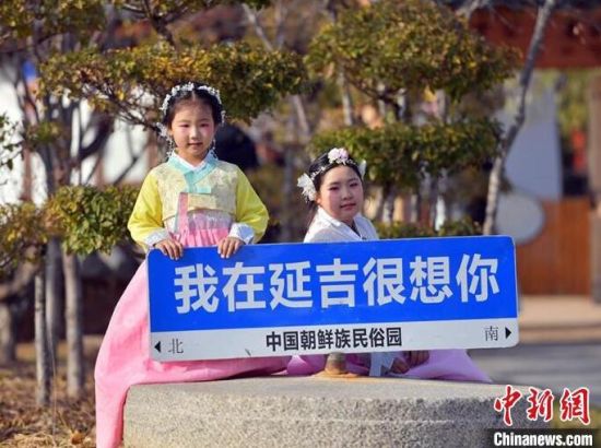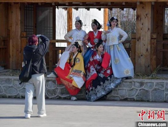 游客身著朝鮮族服飾拍照留念。