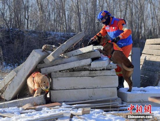 1月18日,在吉林省森林消防總隊(duì)特勤大隊(duì)訓(xùn)練場內(nèi),搜救犬正在訓(xùn)練。為提高搜救犬在嚴(yán)寒環(huán)境的適應(yīng)和實(shí)戰(zhàn)能力,吉林省森林消防總隊(duì)特勤大隊(duì)搜救犬分隊(duì)近期通過障礙攀登、繞腿訓(xùn)練、廢墟搜索訓(xùn)練等科目,對(duì)搜救犬進(jìn)行冬訓(xùn),進(jìn)一步提升訓(xùn)導(dǎo)員與搜救犬的默契度和技戰(zhàn)素養(yǎng)。