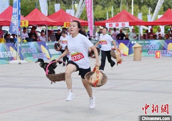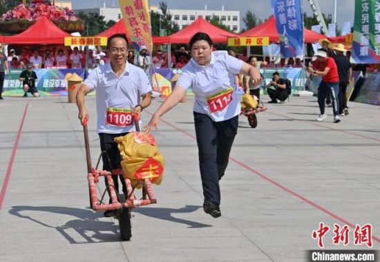 8月16日,吉林長春,農(nóng)民趣味運動會在長春農(nóng)博園精彩上演,運動會設(shè)置了“喜獲豐收”“回娘家”“農(nóng)田大力士”等充滿鄉(xiāng)村特色的比賽項目。圖為選手在“喜獲豐收”比賽中。中新社記者 張瑤 攝