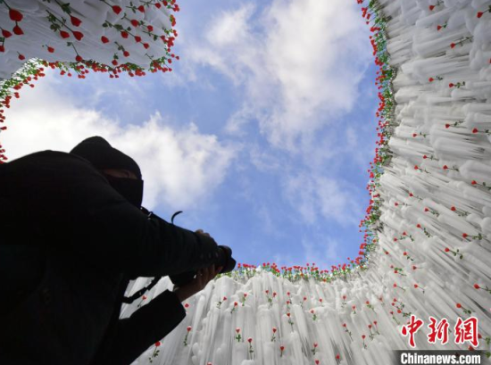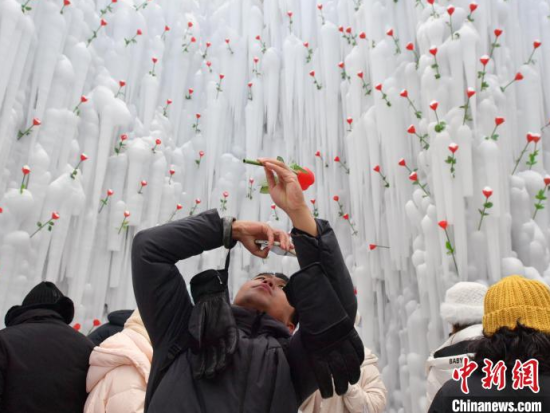 12月26日,吉林長白山,游客在冰洞內(nèi)打卡。進(jìn)入雪季,長白山推出“愛心冰封玫瑰”吸引大量游客打卡拍照,冰洞內(nèi)被玫瑰道具環(huán)繞,洞頂呈心形,充滿浪漫氣息。
