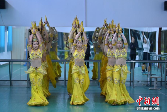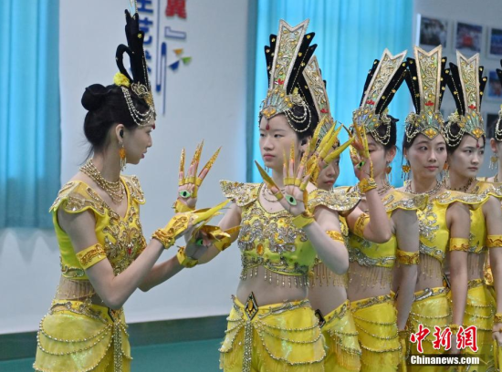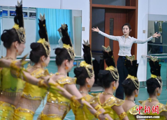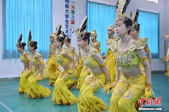 4月22日,在長春大學(xué)特殊教育學(xué)院,學(xué)生們在排練《千手觀音》。這所學(xué)院擁有一支由29名聽障學(xué)生組成的舞蹈團隊。他們因?qū)ξ璧傅臒釔鄱奂谝黄穑跓o聲的世界中舞出他們精彩的人生篇章。中新社記者 張瑤/攝