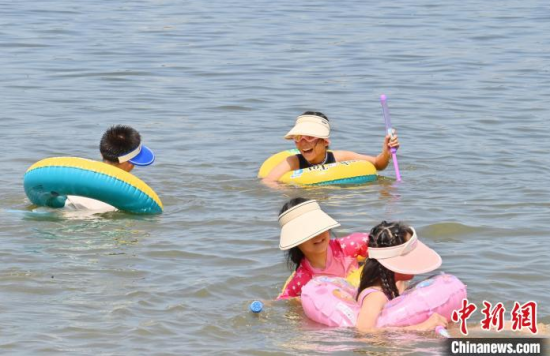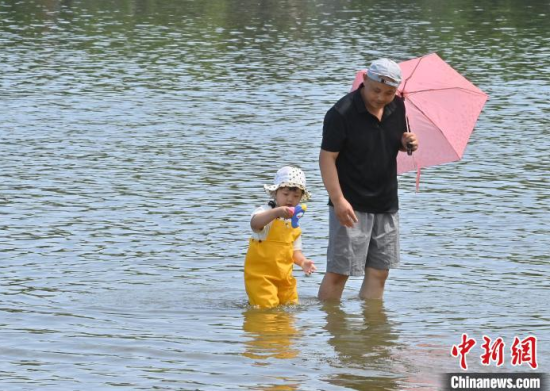 7月8日,吉林長春,小朋友來到南湖公園戲水避暑。長春的高溫“桑拿天”已持續(xù)多日,大批市民來到公園親水納涼。中新社記者 張瑤 攝