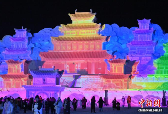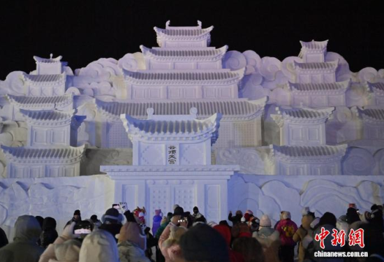 12月26日晚,吉林長白山,新落成的高30米、寬70米、用雪量10萬立方米的雪雕版“云頂天宮”正式點亮。這座以探險題材小說《盜墓筆記》為藍本雕琢的冰雪地標(biāo)廣受書迷關(guān)注。中新社記者 張瑤 攝